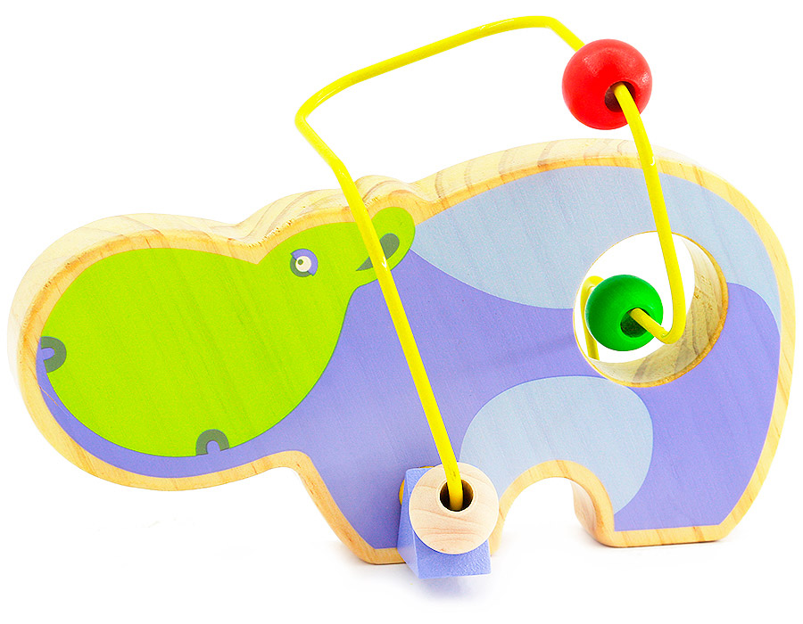 Лабиринт представляет собой деревянное основание в виде бегемота , к которому надежно прикреплена изогнутая металлическая проволока. На спираль нанизаны бусины различной формы и размеров. Ребенок сможет передвигать разноцветные фигурки от одного конца проволоки к другому, развивая при этом тактильное и визуальное восприятие. Игрушка способствует развитию моторики, тренирует мышцы кисти, отрабатывает круговые движения, стимулирует визуальное восприятие, когнитивное мышление, развивает интеллектуальные способности и воображение. Отлично подойдет для первых знакомств с цветом и формой.