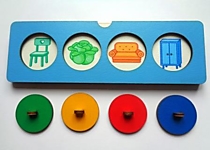 1. Вставьте в планшет деревянную карточку с картинками, закройте окошечки. Планшет готов к игре: предложите ребенку открыть кружки и назвать, что изображено на картинках и какой предмет из них лишний. Почему?