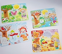 Элементы игры крепятся к карточке-основе с помощью соединения липучек «велькро». Игра учит различать времена года, тренирует мелкую моторику рук, точность, развивает логику и память.