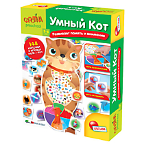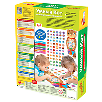 Набор содержит 144 карточки с изображением предметов и персонажей из 6 тематик. Игровое поле представляет собой кота с изображениями предметов и волчком в лапах.